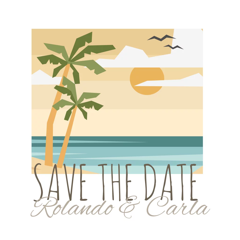 Quadratische, weiße Save the Date Karte mit sommerlichem Strandmotiv und Palmen in gelb, grün und blau.
