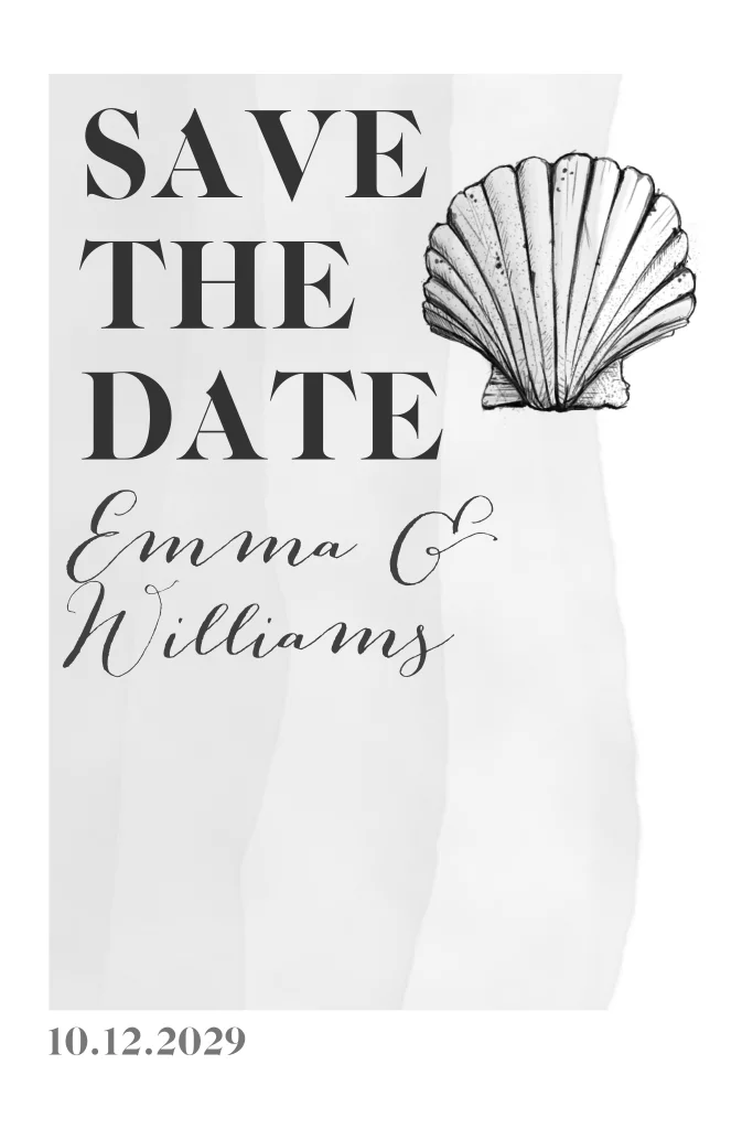 Schlichte Save the Date Karte mit Strand und Muschel in grau