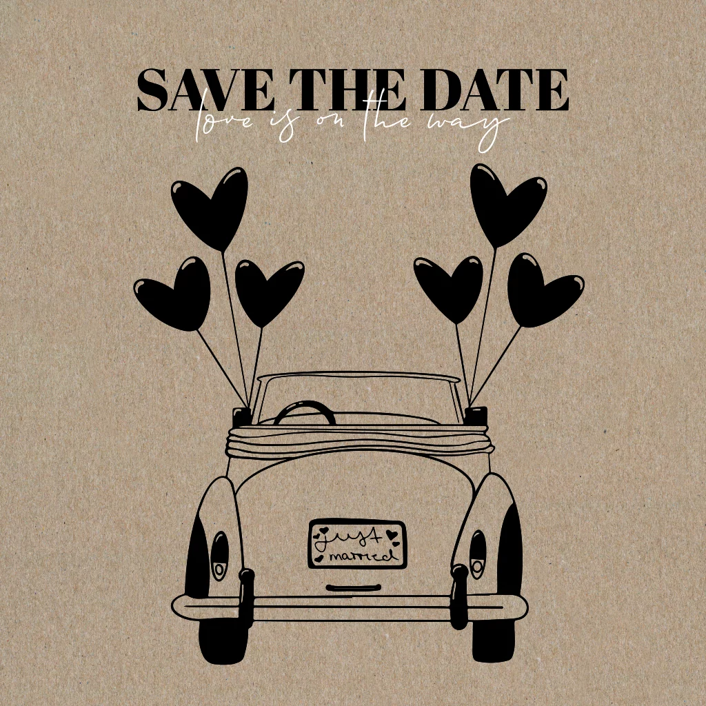 Quadratische Save the Date Karte aus Kraftpapier mit Oldtimer und "just married" Schild. Der Wagen mit Herz-Luftballons ist in schwarz gestaltet.