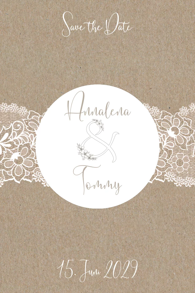 Rustikale Save the Date Karte aus Kraftpapier. Die Karte im Hochformat ist mit weißem zarten Spitzen Design gestaltet.