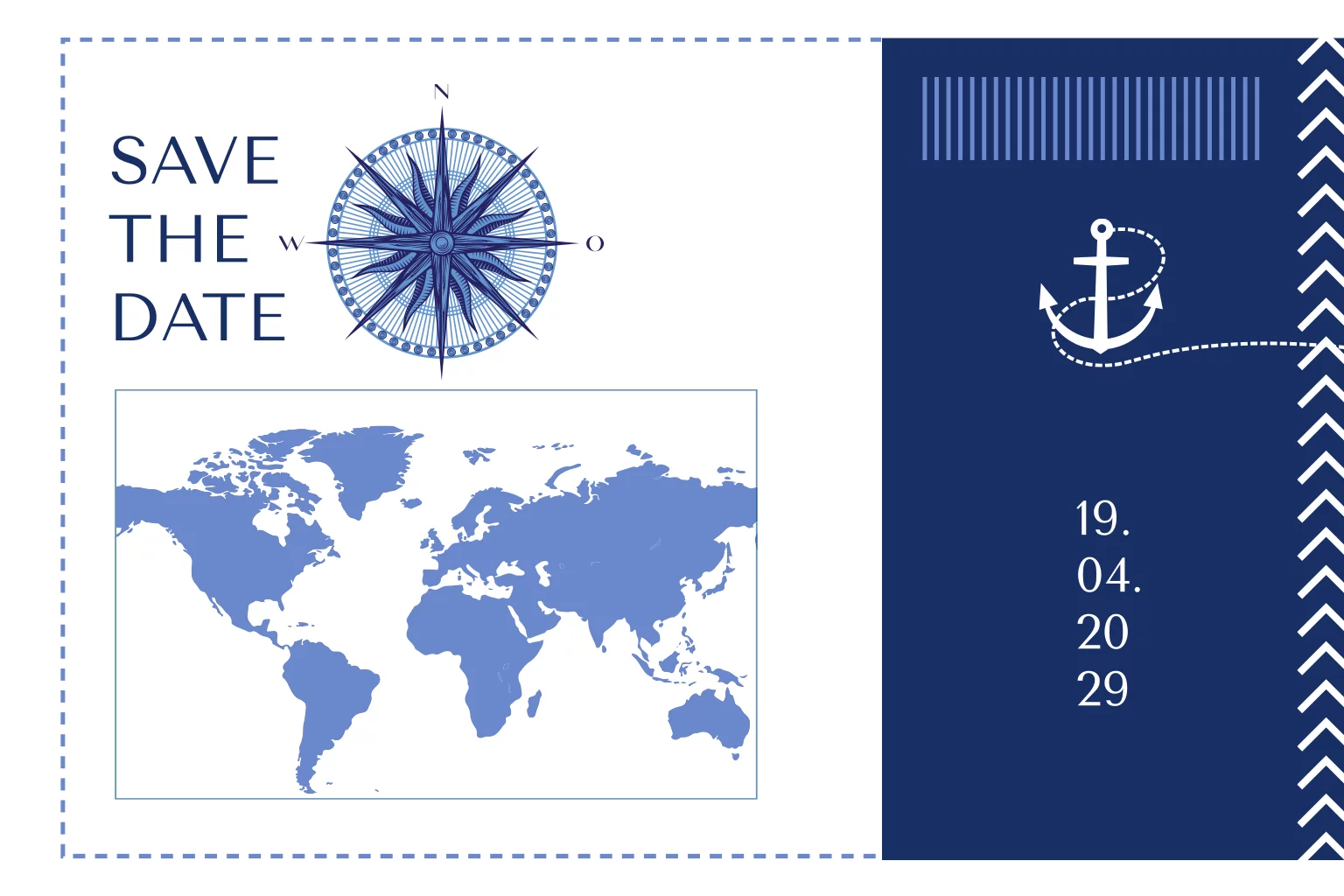 Maritime Save the Date Karte in blau mit Weltkarte, Kompass und Anker
