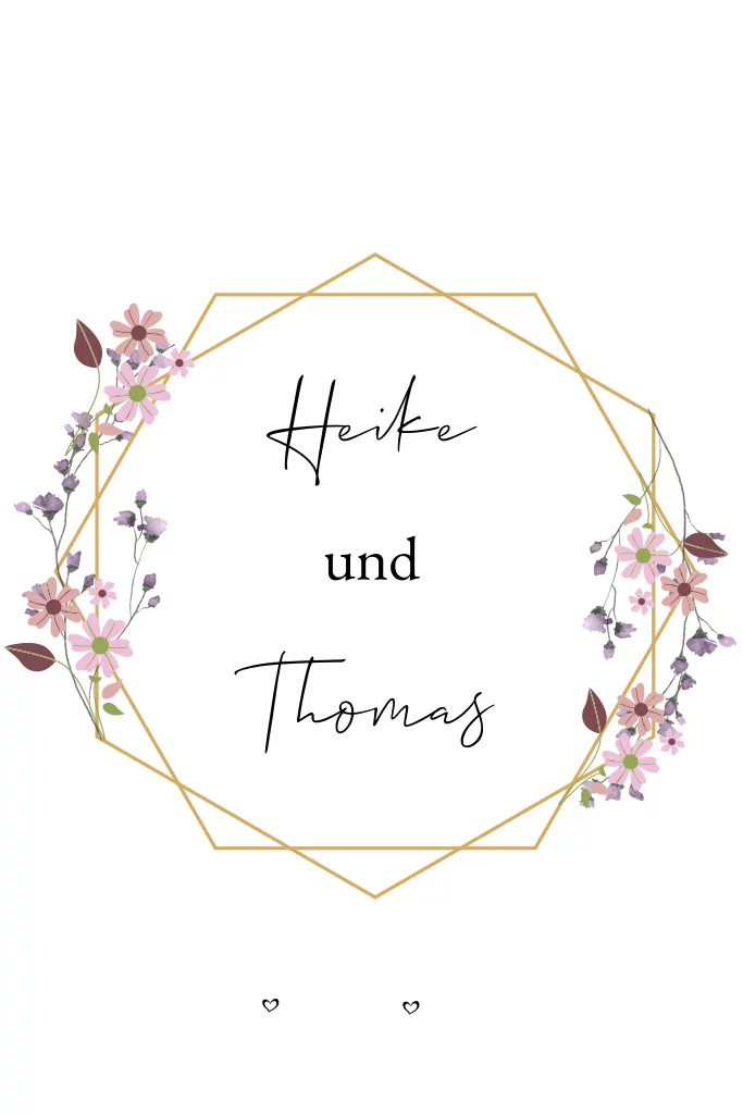 Diese Save the Date Karte im modernen Design mit floralen Elementen in lila und rosa sind mit einem Goldrahmen verziert.
