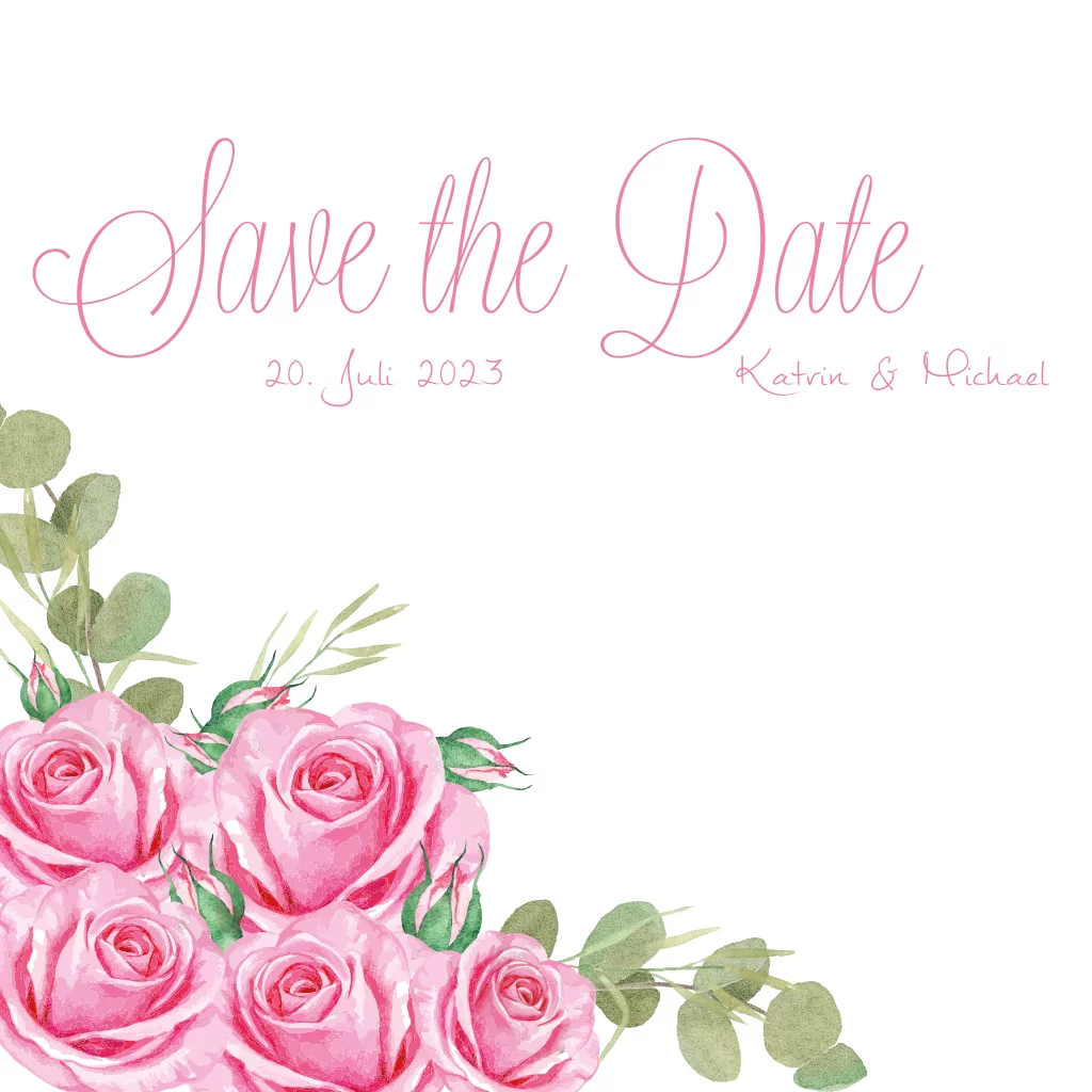 Weiße Save the Date Karte mit Rosen in pink und rosa. Die quadratische Karte hat Eukalyptus Zweige.