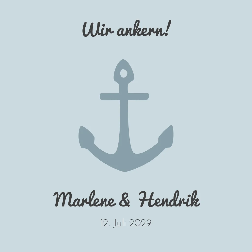 Quadratische Save the Date Karte mit abgerundeten Ecken in blau. Die schlichte Karte ist im maritimen Stil designt und wird von einem Anker geziert.