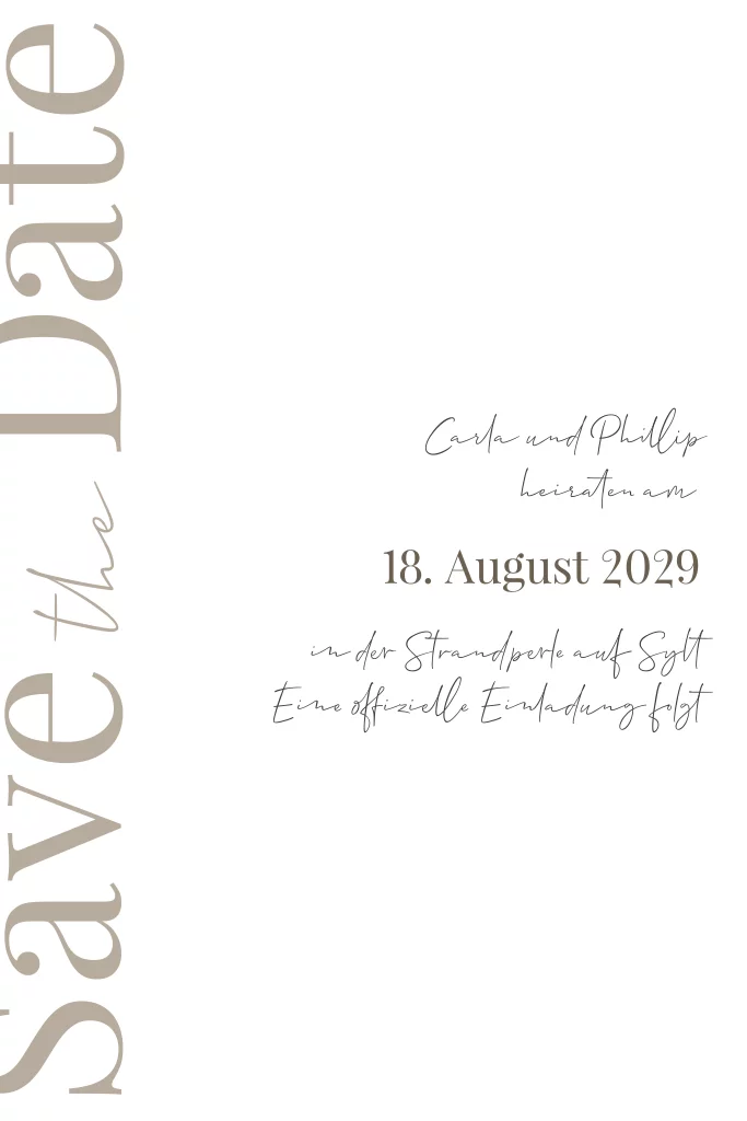 Wendbare Save the Date Karte in schlichter Gestaltung. Vorderseite der Karte im Hochformat ist weiß und die andere Seite in beige gehalten.