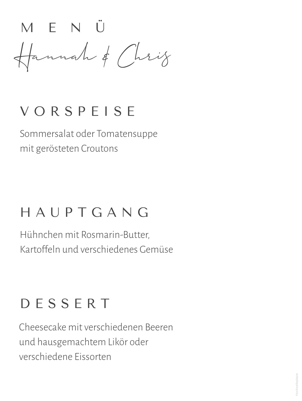 Elegantes, schlichtes Menüschild zur Hochzeit in weiß und schwarz