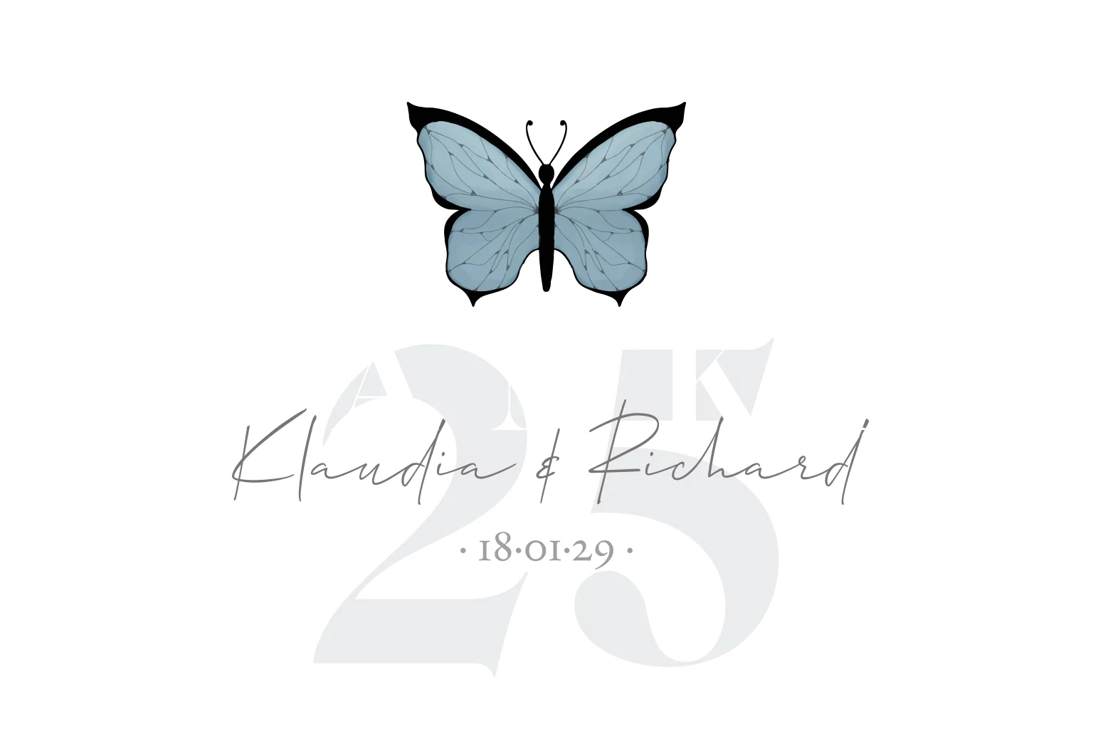 Weiße Klappkarte im Postkartenformat als Danksagung zum 25. Ehejubiläum mit Schmetterling und schwarzer Folierung.