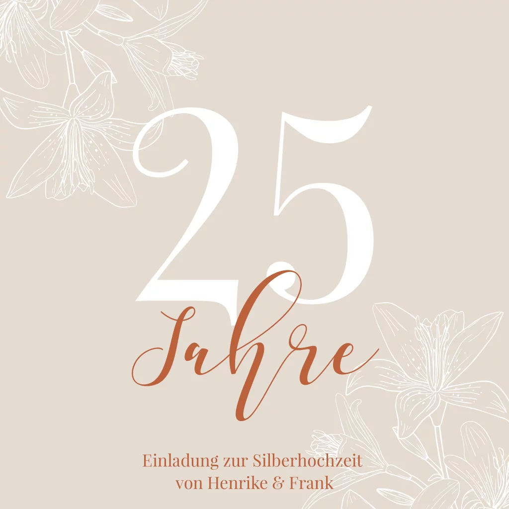 Edle Einladung zum 25. Ehejubiläum in beige. Die quadratische Karte mit weißen Line Art Linien erscheint im edlen Design.