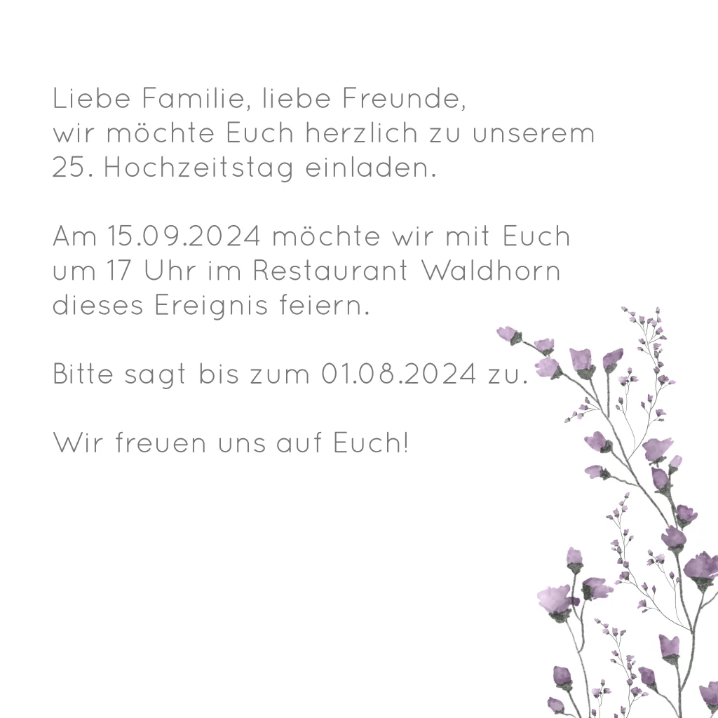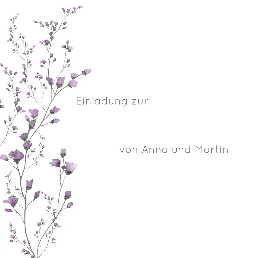 Quadratische Einladung zur Silberhochzeit mit zarten lila Blumen