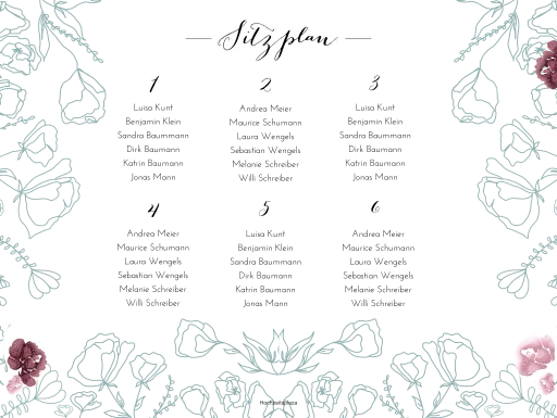 Für die Hochzeitsfeier: Sitzplan mit Rosen und floraler Line Art im Querformat in 73x55 cm. Künstlerisch - malerisch sind die Rosen in Grün- und Rottönen gestaltet. Unsere Sitzpläne werden auf Forex gedruckt, welches ein 5mm dickes, wetterfestes Plattenmaterial ist, das Sonne und Regen sehr gut standhält. Die Folierung ist leider auf diesem Material nicht möglich.