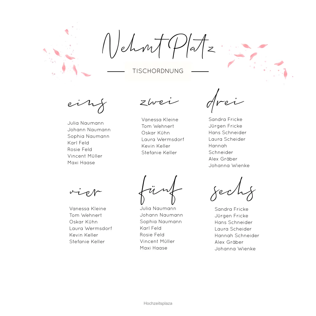Weißer Sitzplan für die Hochzeitsparty in rund mit einem 55 cm Durchmesser. Das Handlettering und rosa Blüten zieren das minimalistische, moderne Design. Unsere Sitzpläne werden auf Forex gedruckt, welches ein 5mm dickes, wetterfestes Plattenmaterial ist, das Sonne und Regen sehr gut standhält. Die Folierung ist leider auf diesem Material nicht möglich.