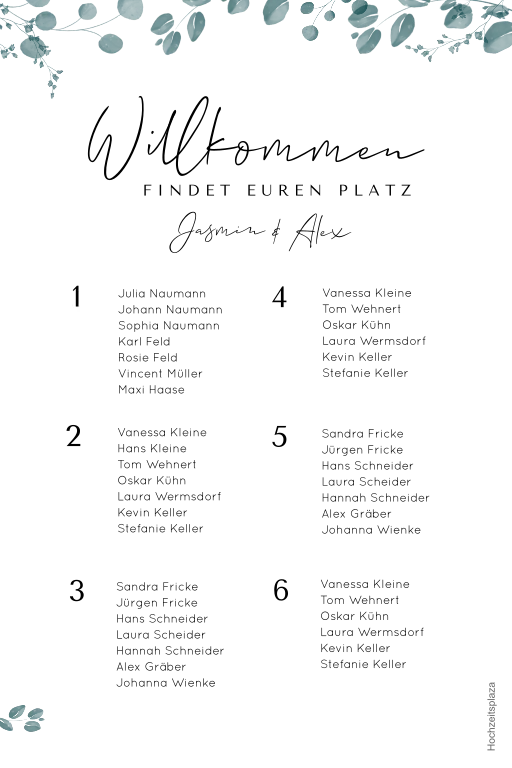 Greenery Sitzplan stehend für die Hochzeit mit Eukalyptus in 40x60 cm