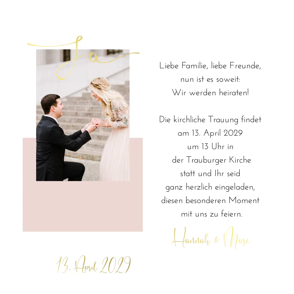 Dreiteilige Einladung zur kirchlichen Trauung mit Foto und Goldfolie