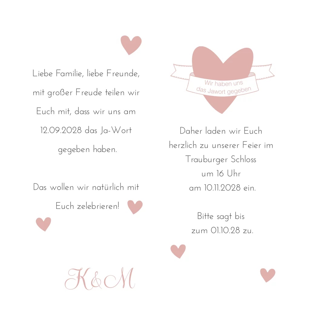 Wir haben uns das Jawort gegeben Karten-Set mit Herz-Banner "Wir haben uns getraut" in rosa. Die weißen drei einzelnen Karten können mit einer Schnur oder Kordel verbunden werden. (Die Dinge müssen extra gekauft werden.)