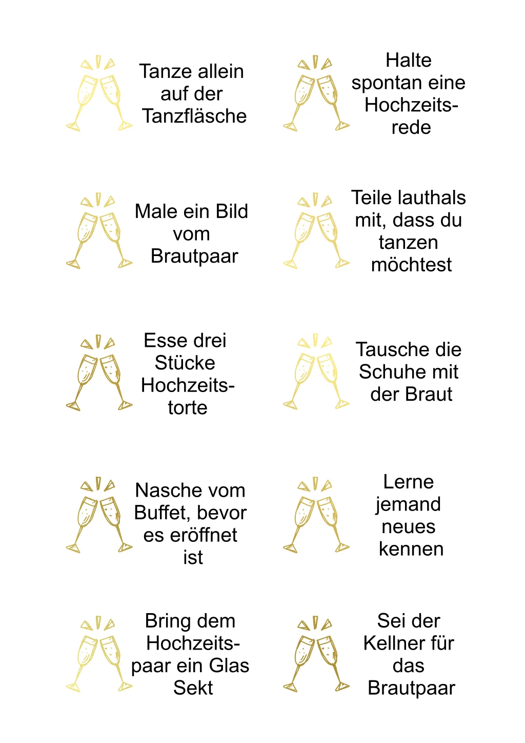 20 Kärtchen zur Unterhaltung der Gäste auf der Hochzeitsfeier. Die Aufgaben in Visitenkartenformat in 8x5 cm mit Sektglas sind eine tolle Unterhaltungsidee für die Gäste. Außerdem werden einige der Aufgaben zur Erinnerung des Brautpaares.