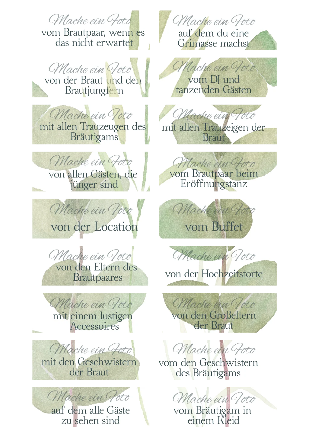 18 längliche Aufgabenkarten mit Fotoaufgaben zur Unterhaltung der Gäste auf der Hochzeit. Die Kärtchen im greenery Design sorgen für witzigen Unterhaltungsspaß auf der Feier. Praktische Unterhaltung für die Hochzeitsfeier in 8 x 2,7 cm zum Anpassen.