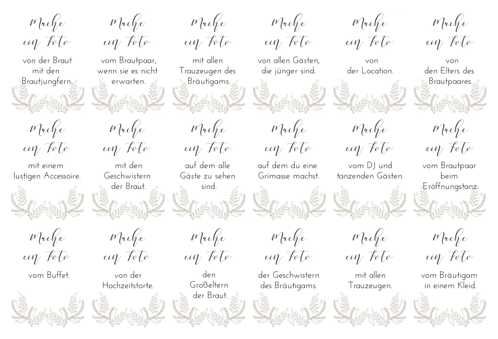18 weiße Spielkarten mit Fotoaufgaben zur Unterhaltung der Gäste auf der Hochzeit. Die Kärtchen mit zarten Line Art Zweigen in beige sorgen für witzigen Unterhaltungsspaß auf der Feier.