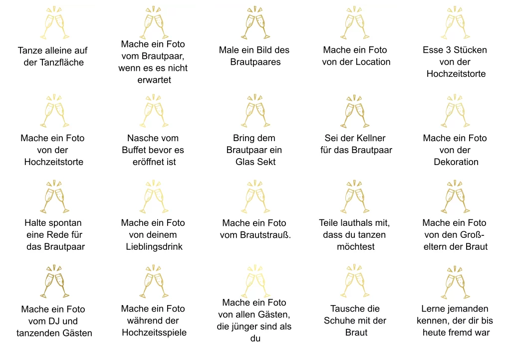 20 Kärtchen zur Unterhaltung der Gäste auf der Hochzeitsfeier. Die Aufgaben in quadratischer Form in 7x7 cm mit Sektglas sind eine tolle Unterhaltungsidee für die Gäste. Außerdem werden einige der Aufgaben zur Erinnerung des Brautpaares.