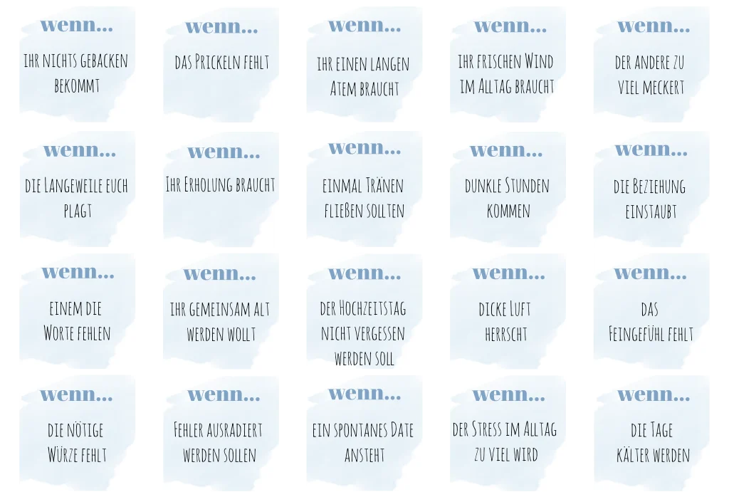 20 Ehe-Notfall-Kärtchen als Hochzeitsgeschenk mit blauem Aquarellhintergrund in quadratischer Form in 7x7 cm. Für die Gestaltung eines Ehe-Notfall-Koffers könnt ihr die Karten passenden Gegenständen zu ordnen. Zum Beispiel eine Flasche Sekt für die Karte: "Wenn das Prickeln fehlt" oder Taschentücher "Wenn einmal Tränen fließen sollten". Eurer Fantasie sind keine Grenzen gesetzt. Für mehr Inspiration könnt ihr euch den folgenden Artikel anschauen: Der Ehe-Notfallkoffer - ein kreatives Hochzeitsgeschenk.