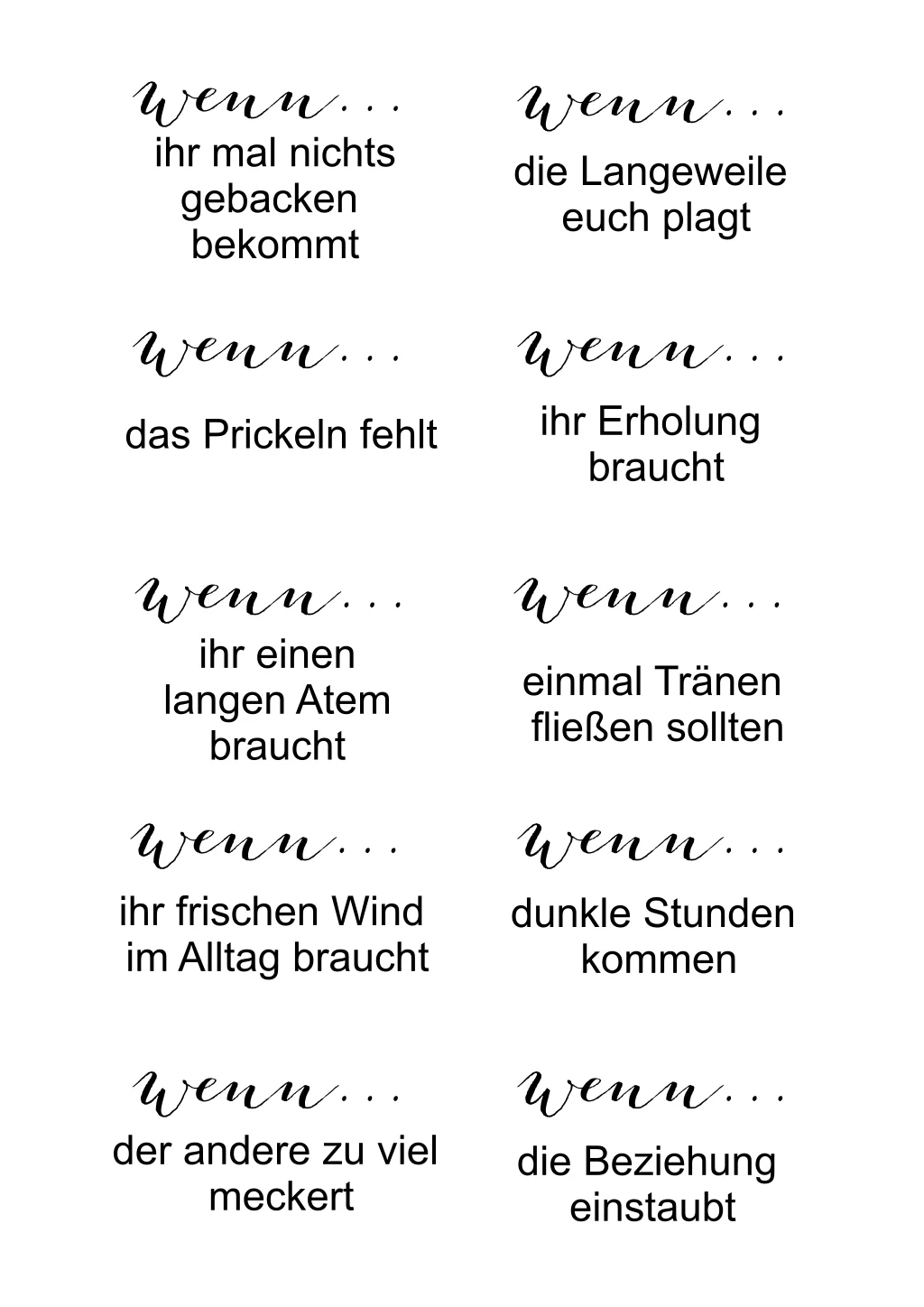 20 schlichte Ehe-Notfall-Kärtchen in quadratischer Form in 8x5 cm zum Selbstgestalten. Perfekt als Hochzeitsgeschenk für die Gestaltung eines Ehe-Notfall-Koffers. Dafür könnt ihr die Karten passenden Gegenständen zu ordnen. Zum Beispiel ein Gewürz für die Karte: "Wenn die nötige Würze fehlt" oder ein Wörterbuch "Wenn einem die Worte fehlen". Für mehr Ideen könnt ihr euch unseren Artikel anschauen: Der Ehe-Notfallkoffer - ein kreatives Hochzeitsgeschenk.
