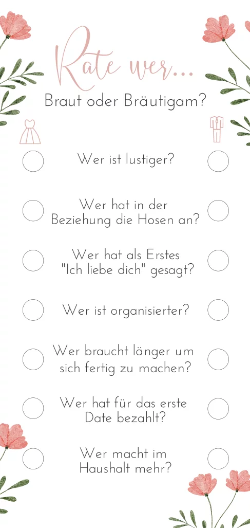 "Rate mal" Spiel zur Unterhaltung der Hochzeitsgäste mit rosa Blumen