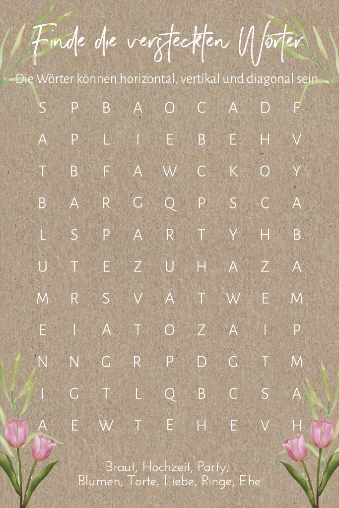 Kreuzworträtsel-Karte für die Unterhaltung der Hochzeitsgäste aus Kraftpapier. Das Spiel mit Greenery Elementen und pinken Tulpen eignet sich perfekt, um Freunde und Familie zu unterhalten während das Brautpaar z.B. beim Fotoshooting ist.