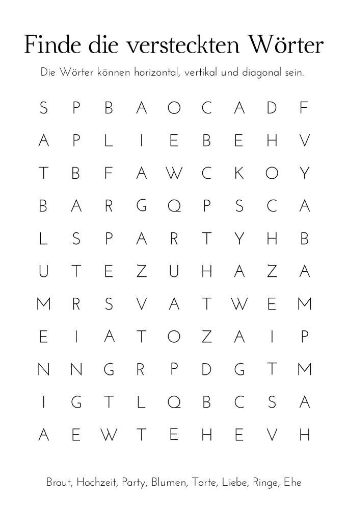 Kreuzworträtsel zur Hochzeitsunterhaltung für das eigene Design. Das Spiel kann nach Euren Wünschen mit passenden Elementen angepasst werden.