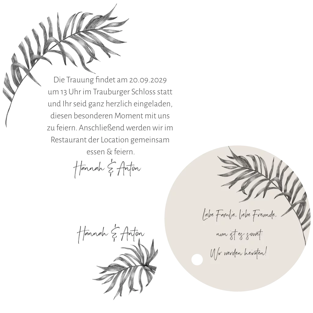 Dreiteilige runde Hochzeinladung im Boho Stil mit Palmenblättern