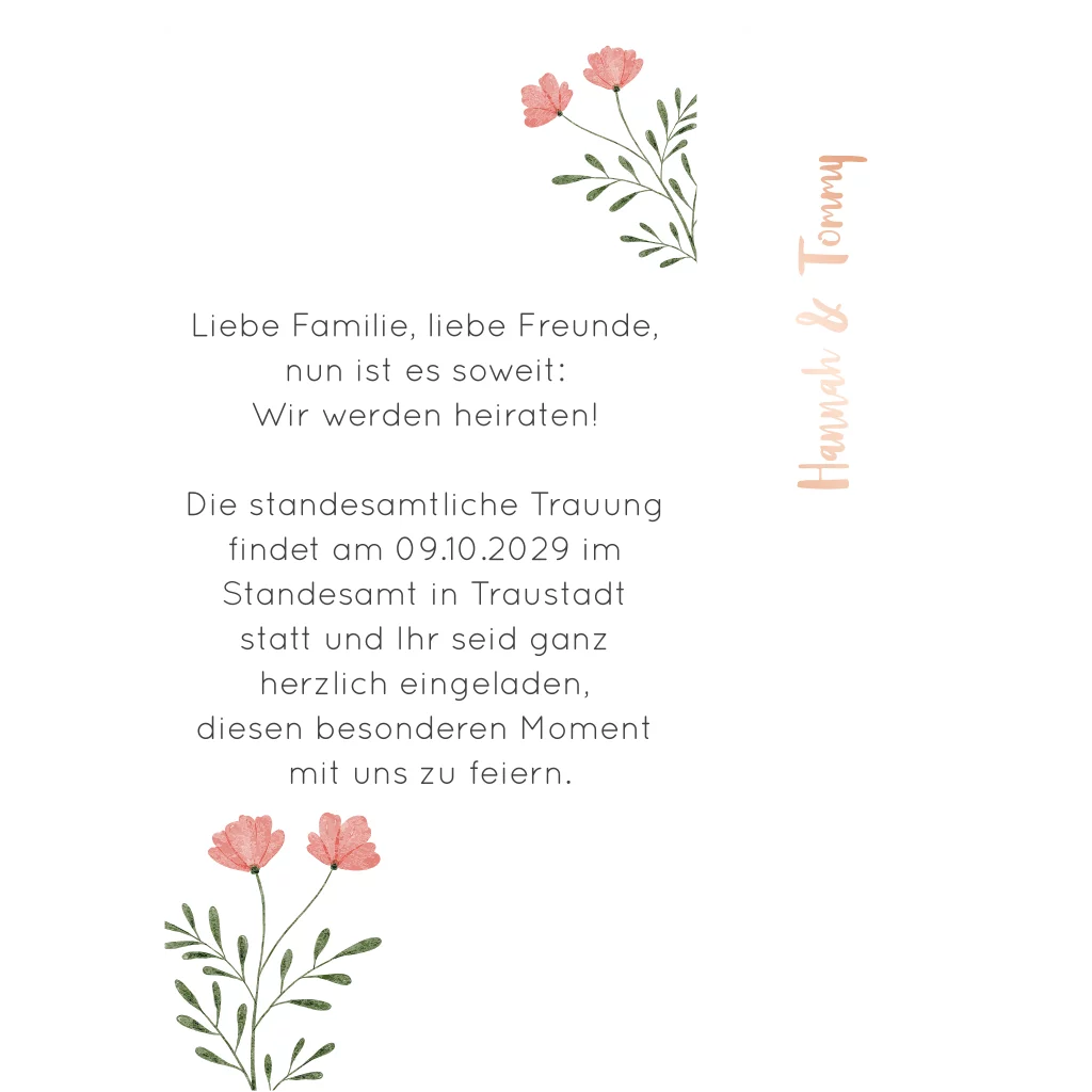 Zweiteilige standesamtliche Einladung mit rosa Blumen + Roségoldfolie
