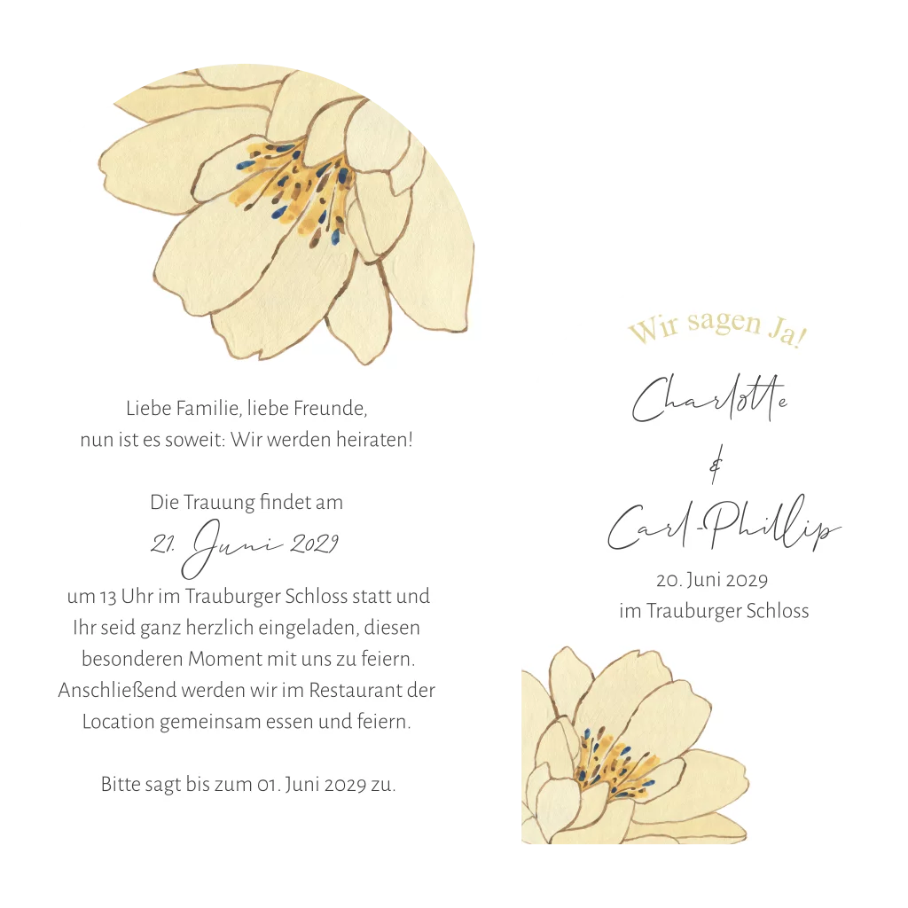 Florale Einladung zur Hochzeit im 2er-Set. Die weißen Karten sind mit gelben großen Blumen verziert.