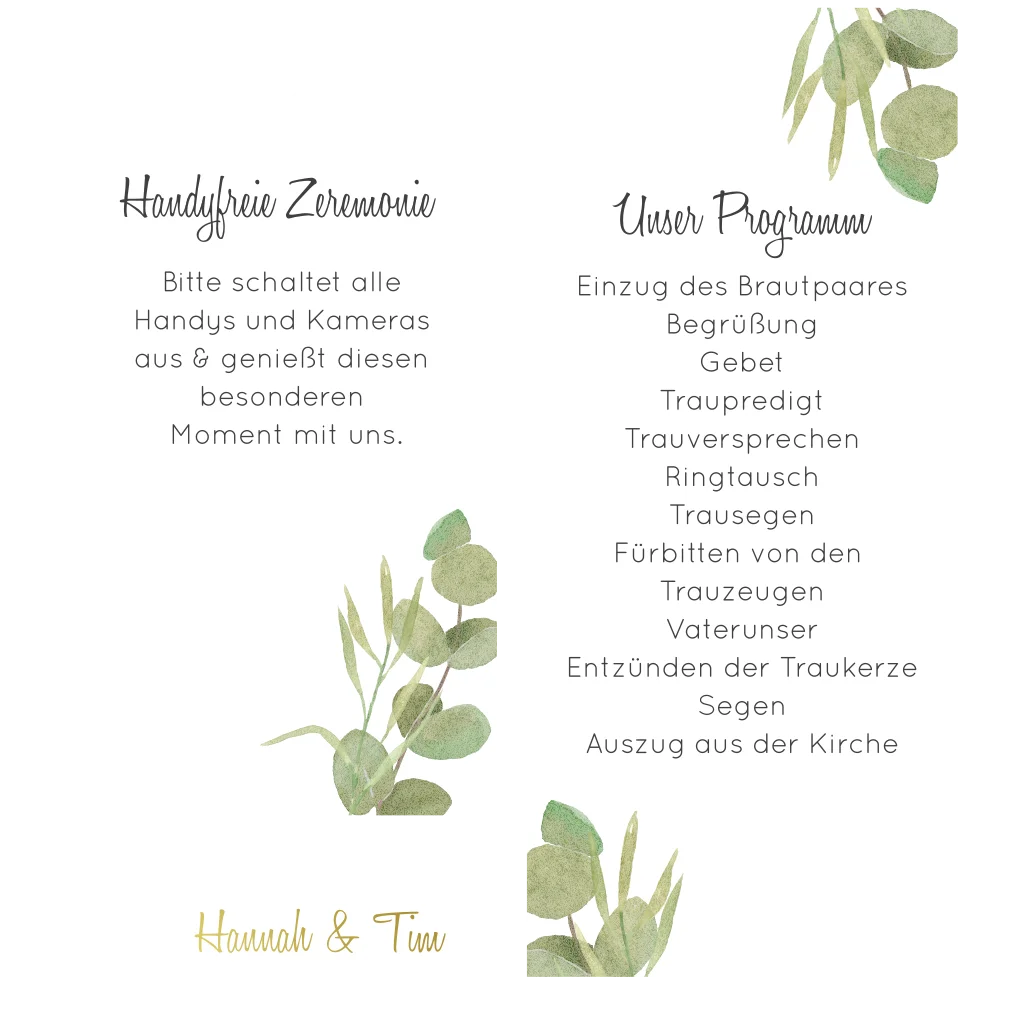 Greenery Kirchenheft zur Hochzeit mit Goldfolie. Die weißen Karten im 3er-Set sind mit Eukalyptus- und Bambuszweigen gestaltet.