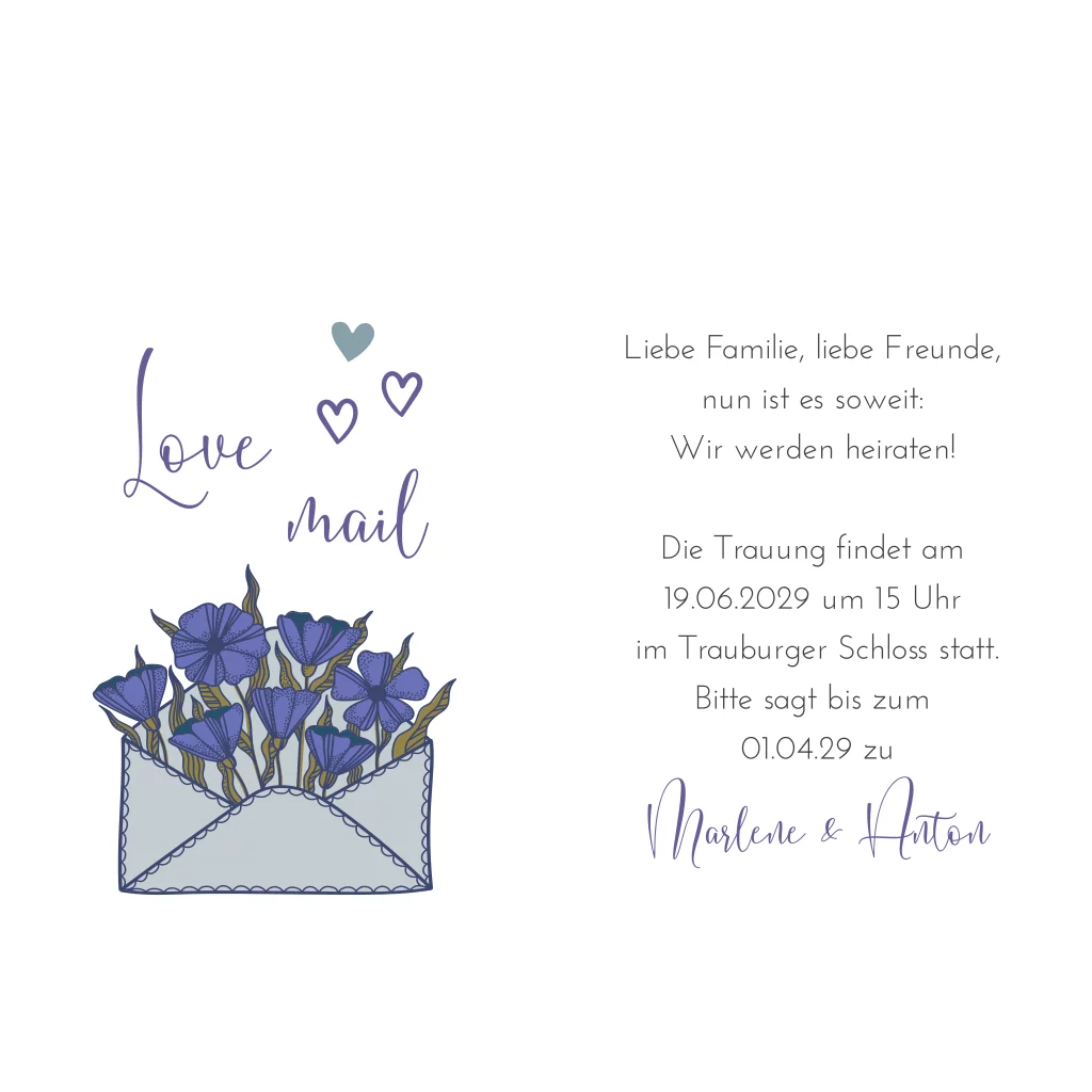 Ausgefallene Einladungskarte zur Hochzeit. Die zweiteilige "Love Mail" mit floraler Illustration in blau und lila ist ein toller Hingucker für Eure Hochzeitsgäste. Die weißen Kartenteile können mit einer Pinnadel oder Kordel verbunden werden. (Diese Produkte müssen extra bestellt werden.)
