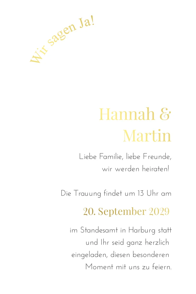 Schlichte besondere Hochzeitskarte mit Bogenform und Goldveredelung