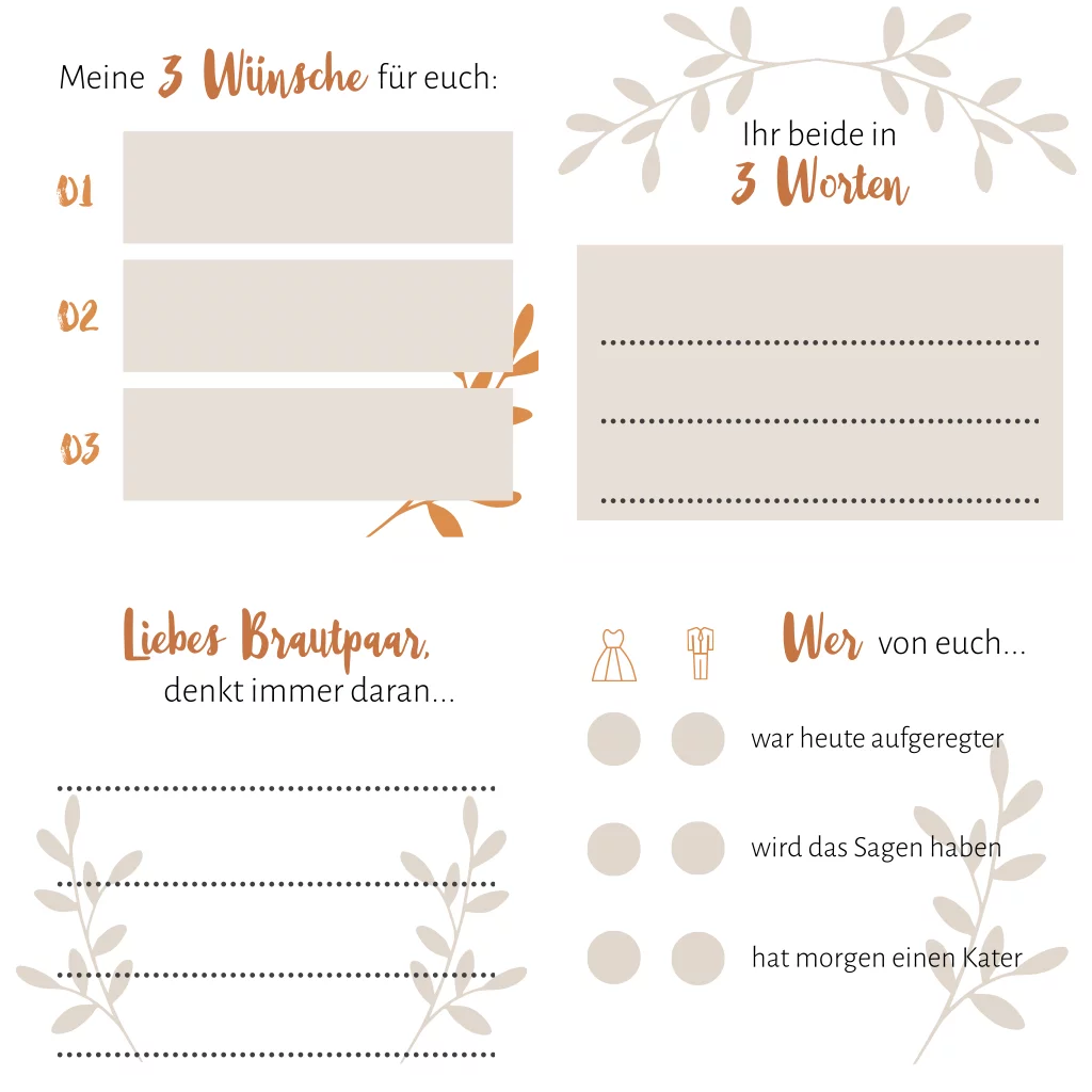 Boho Gästebuchkarten im 4er-Set mit Zweigen in Beige und Kupfer