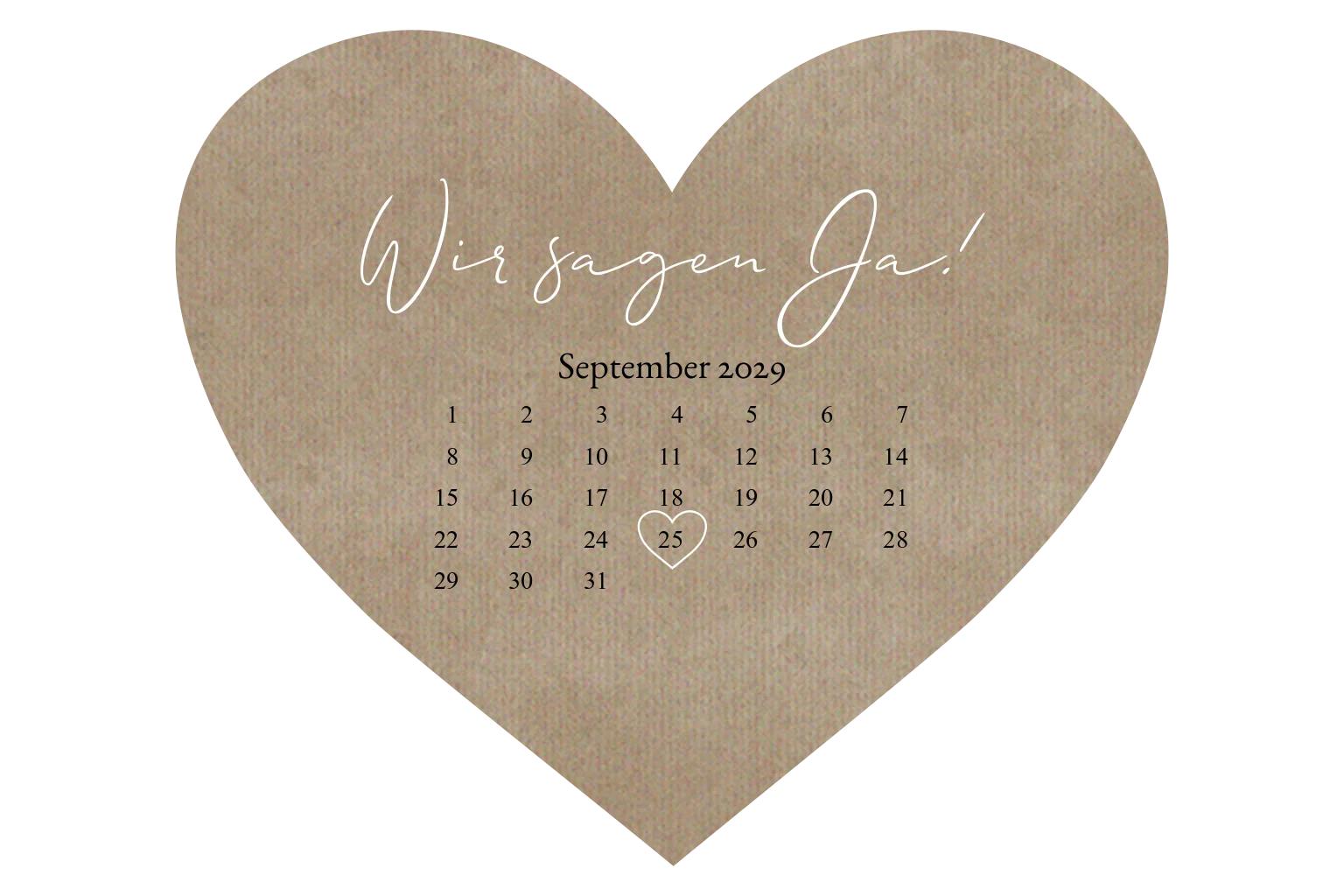 Einladung zur Hochzeit in Herzform mit Kalender im Kraftpapier-Look. Das Kalenderblatt gibt es auch in anderen Formaten. Einfach bei unseren Abbildungen raussuchen.