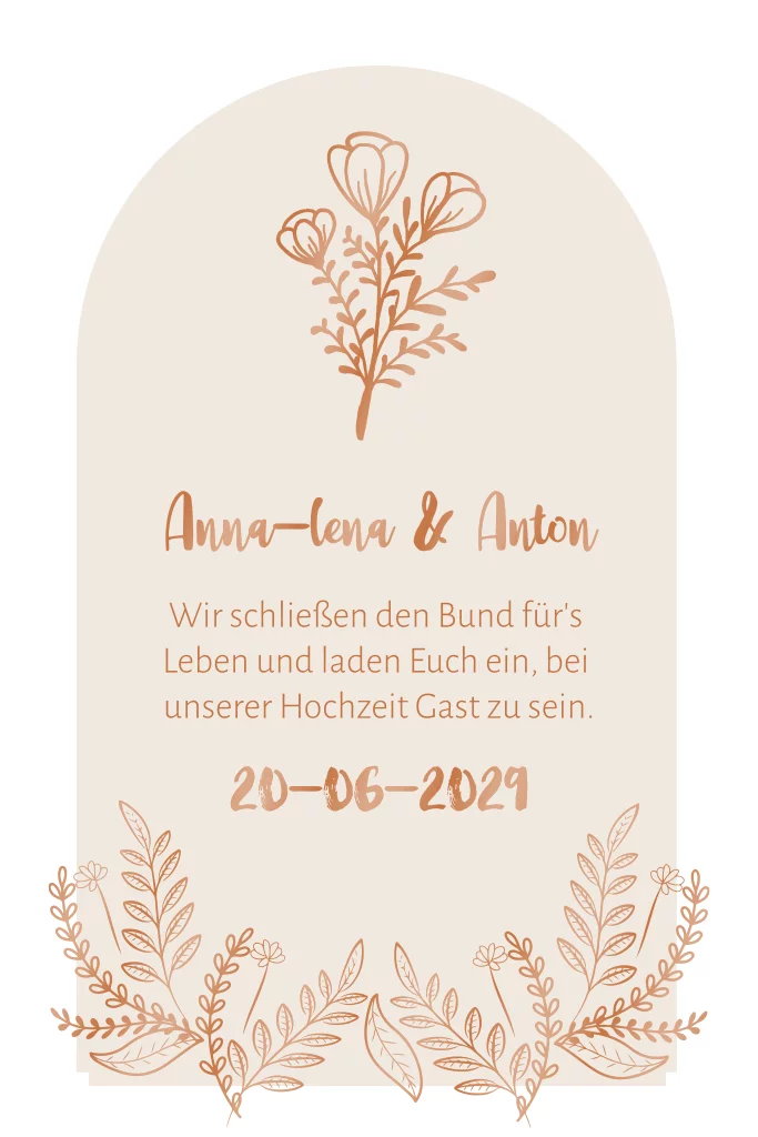 Einladungskarte zur Hochzeit in Bogenform mit floralen Elementen in hochglanzveredeltem Kupfer. Die weiße Karte im Hochformat mit beigem Hintergrund auf der Vorderseite. Die Blume und Greenery Elemente sind auf der Rückseite in beige.