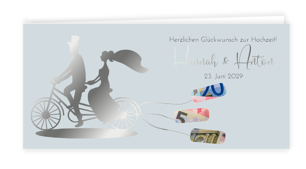 Mit Silberfolie veredelte Klappkarte für ein Geldgeschenk zur Hochzeit. Die graublaue Karte im Panoramaformat ist mit einem Brautpaar auf dem Fahrrad gestaltet. Die Dosen, die vom Fahrrad gezogen werden, sind die Ausstanzungen für die Geldscheine.