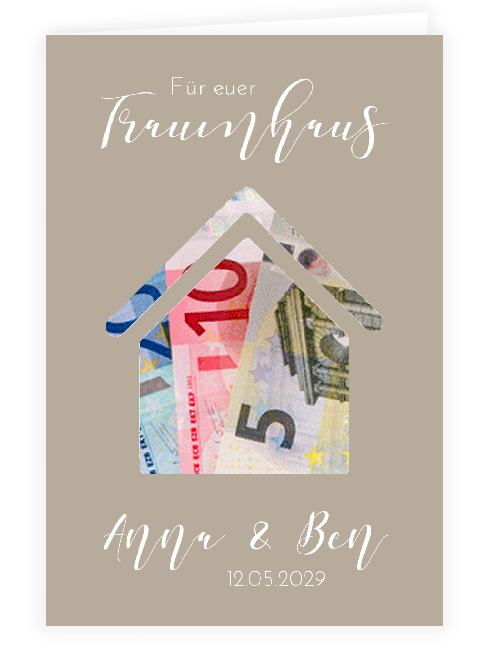 Kieselsteinfarbene Klappkarte für ein Geldgeschenk zur Hochzeit. Die Karte mit Haus-Stanzung passt perfekt, wenn das Hochzeitsgeschenk ein Geldbetrag für den Häuserbau oder die Eigentumswohnung sein soll. Das Geld wird in die Klappkarte gelegt, sodass es durch die Stanzung in Form eines Hauses durchschaut.