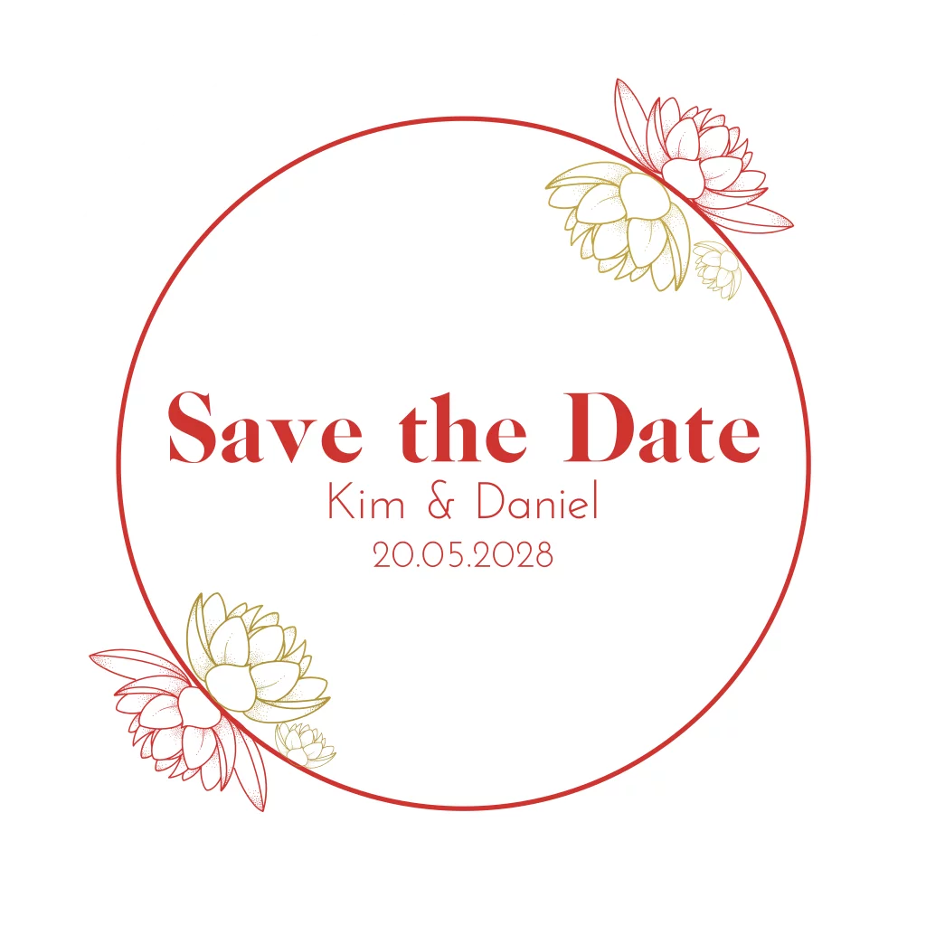 Runde Save the Date Karte mit roten und goldenen Lotusblüten