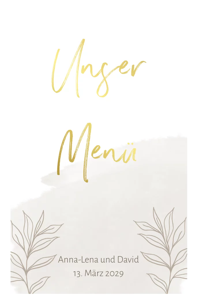 Veredelte Speisekarte zur Hochzeit in Bogenform mit Zweigen in Beige und Goldfolie. Die Rückseite der Karte im Hochformat hat einen zarten Bogen mit Zweigen in schwarz.