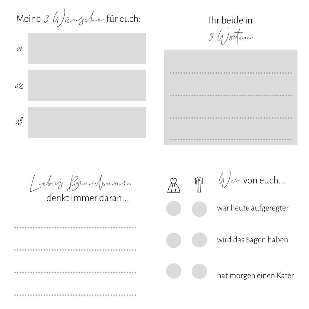 Quadratische Gästebuchkarten als Alternative für das klassische Gästebuch. Die Vorlage bestehend aus 4 weißen Karten kann von Euch schnell und einfach nach Euren Wünschen angepasst werden. Die Kärtchen sind in unterschiedlichen Größen erhältlich.