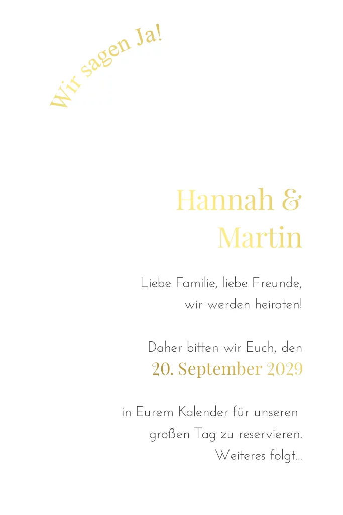 Schlichte, besondere Save the Date Karte in Bogenform und Goldveredelung.