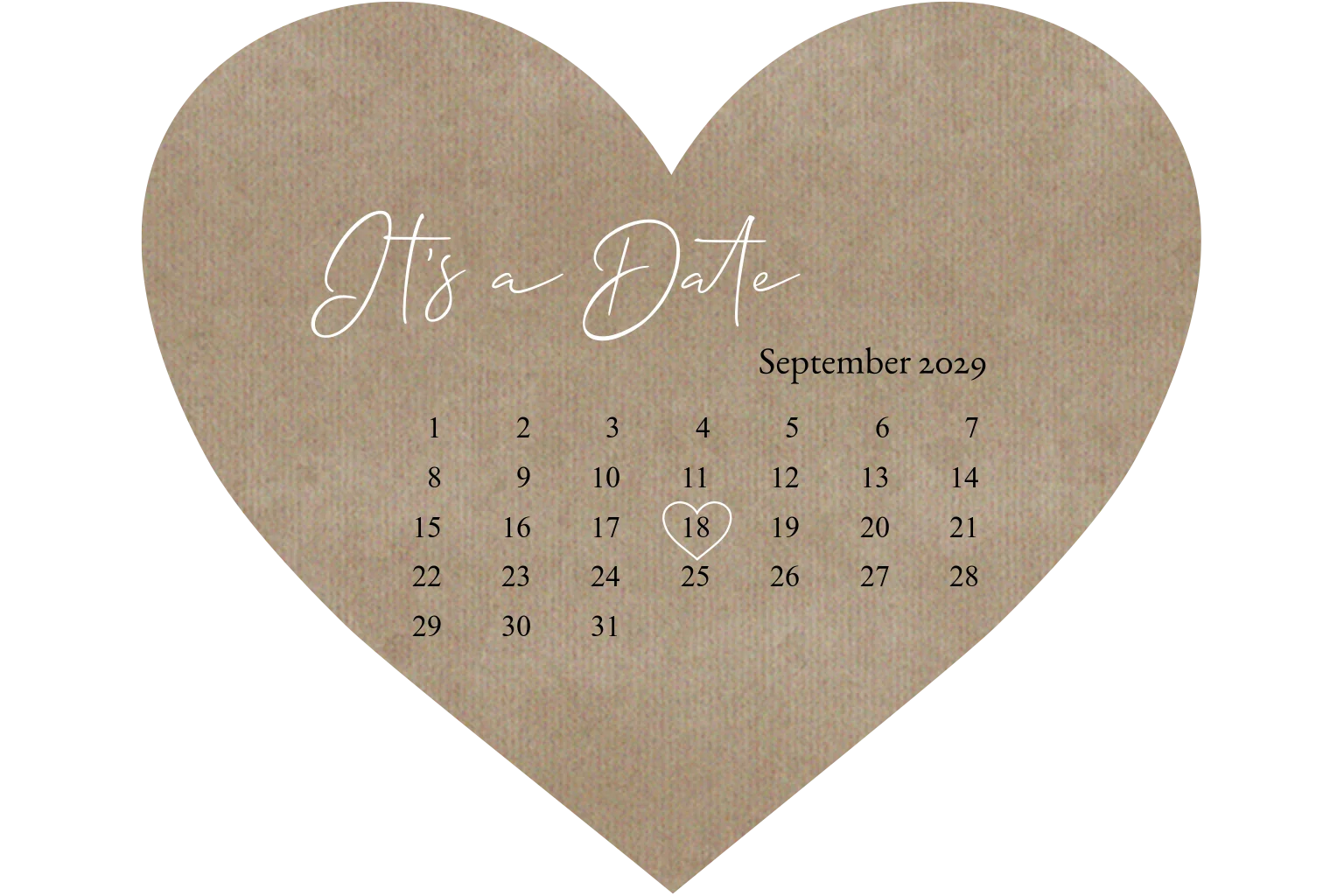 Diese ausgefallene Save the Date Karte in Herzform mit Kalenderblatt im Kraftpapier Look ist mal etwas ganz anderes, um sich Euren großen Tag zu merken. Der Tag des Monats wird mit einem Herzen markiert.