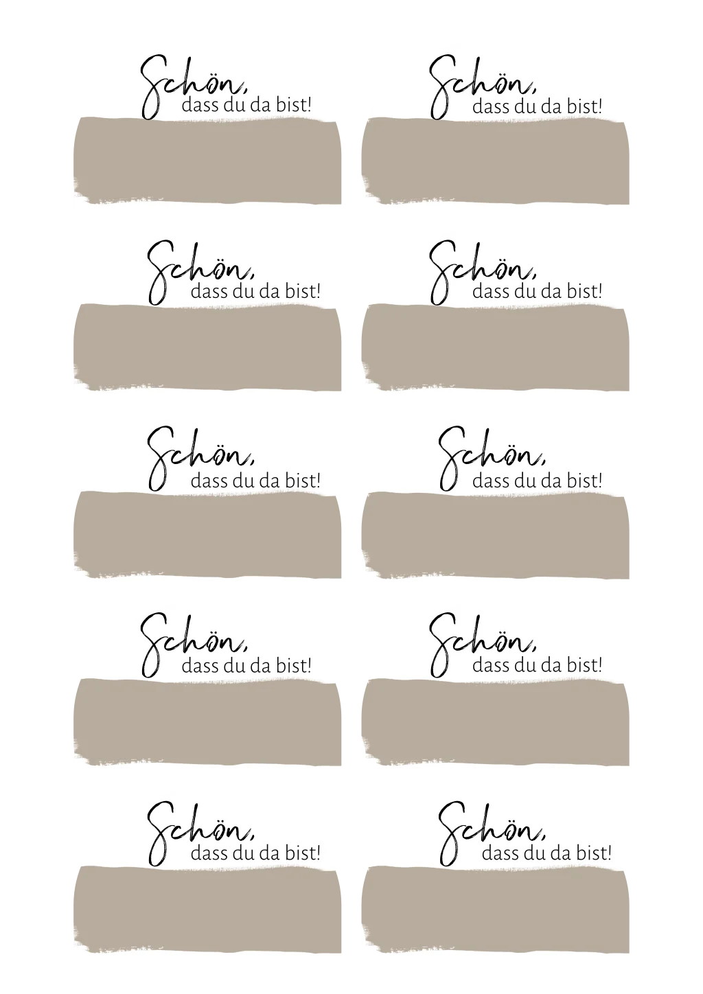 Platzkarten in Bogenform in je 5 x 8 cm. Die moderne Kärtchen mit beigen Pinselstrich können von Euch selbst beschriftet werden oder schon von Euch mit Namen bestückt gedruckt werden.