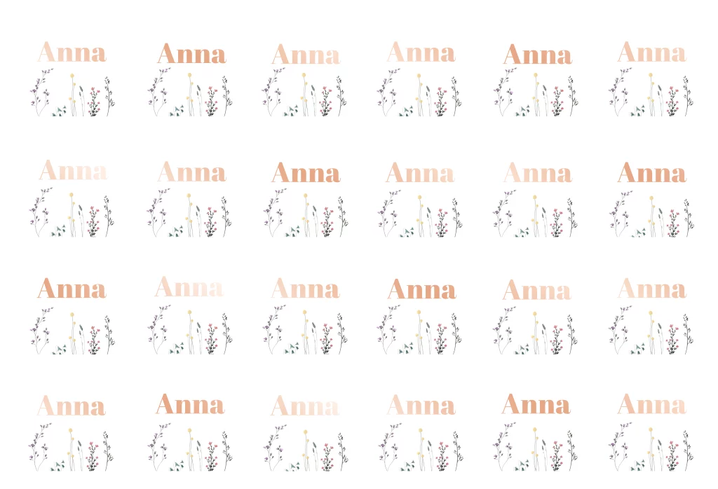 24 veredelte Namenskarten für die Hochzeitsfeier mit bunter Blumenwiese. Die weißen kleinen Tischkärtchen in jeweils 6x6 cm können von Euch mit den entsprechenden Namen angepasst werden. Ein Set wird auf einem Druckbogen in 44x30cm gedruckt.