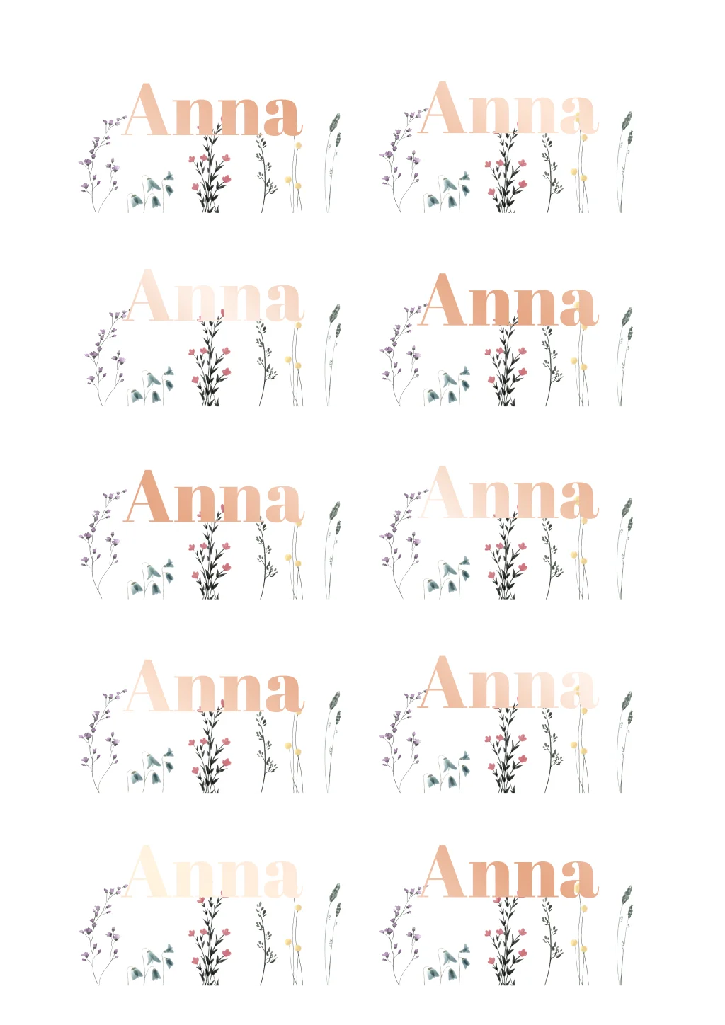 Veredelte Namenskarten für die Hochzeitsfeier mit bunter Blumenwiese. Die weißen kleinen Tischkärtchen in je 5 x 8 cm können von Euch mit den entsprechenden Namen angepasst werden. Je 10 auf einer DIN A4 Seite im Set.