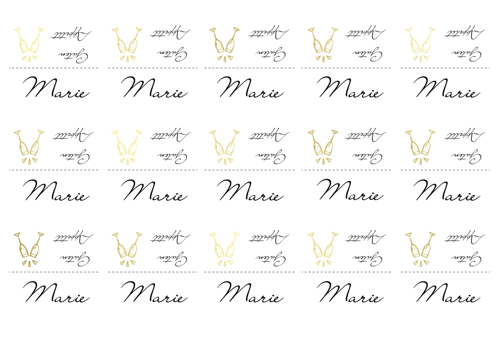 Aufstellbare Namenskarte "Guten Appetit" zur Hochzeit mit Sektglas in gold