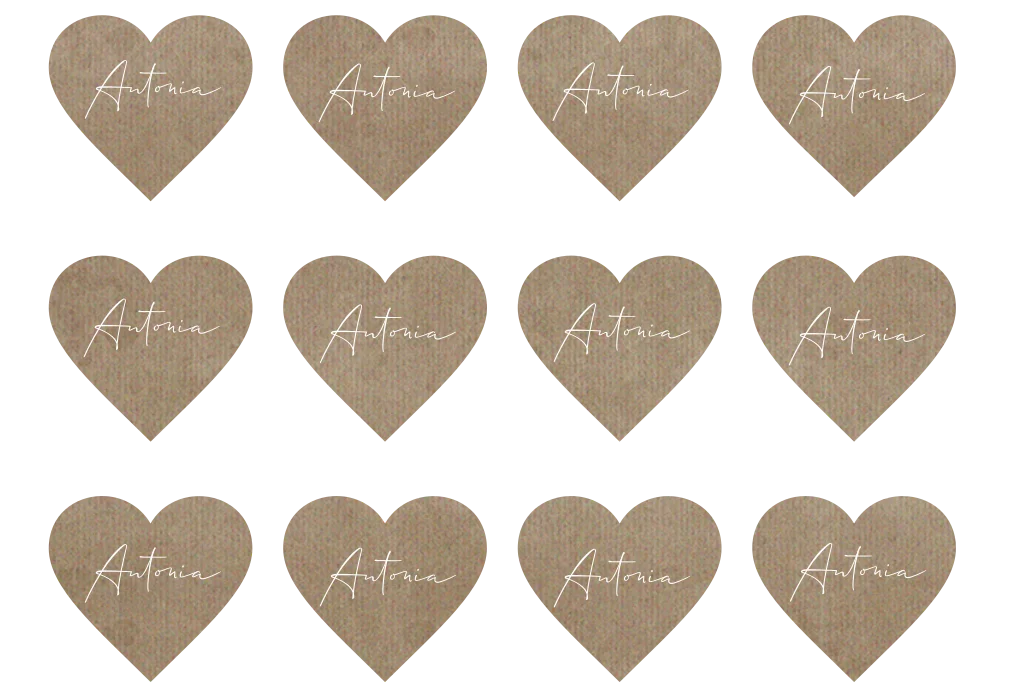 12 schlichte Namenskarten in Herzform für Eure Hochzeit. Eine Herz-Karte in Kraftpapier-Optik mit weißer Schrift hat eine Größe von 8x7 cm. Das Set mit Herzen wird auf einem Druckbogen von 44x30cm gedruckt.