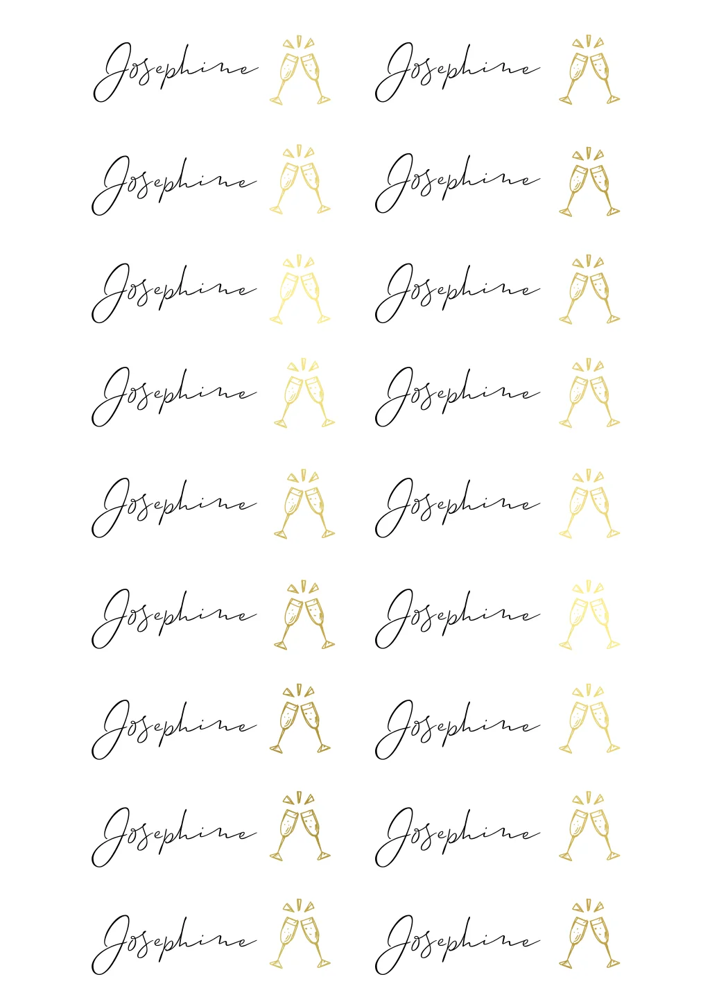 Schlichtes quadratisches Tischkärtchen mit vergoldetem Sektglas. Jedes weißes Platzkärtchen ist in 8 x 2,7 cm.