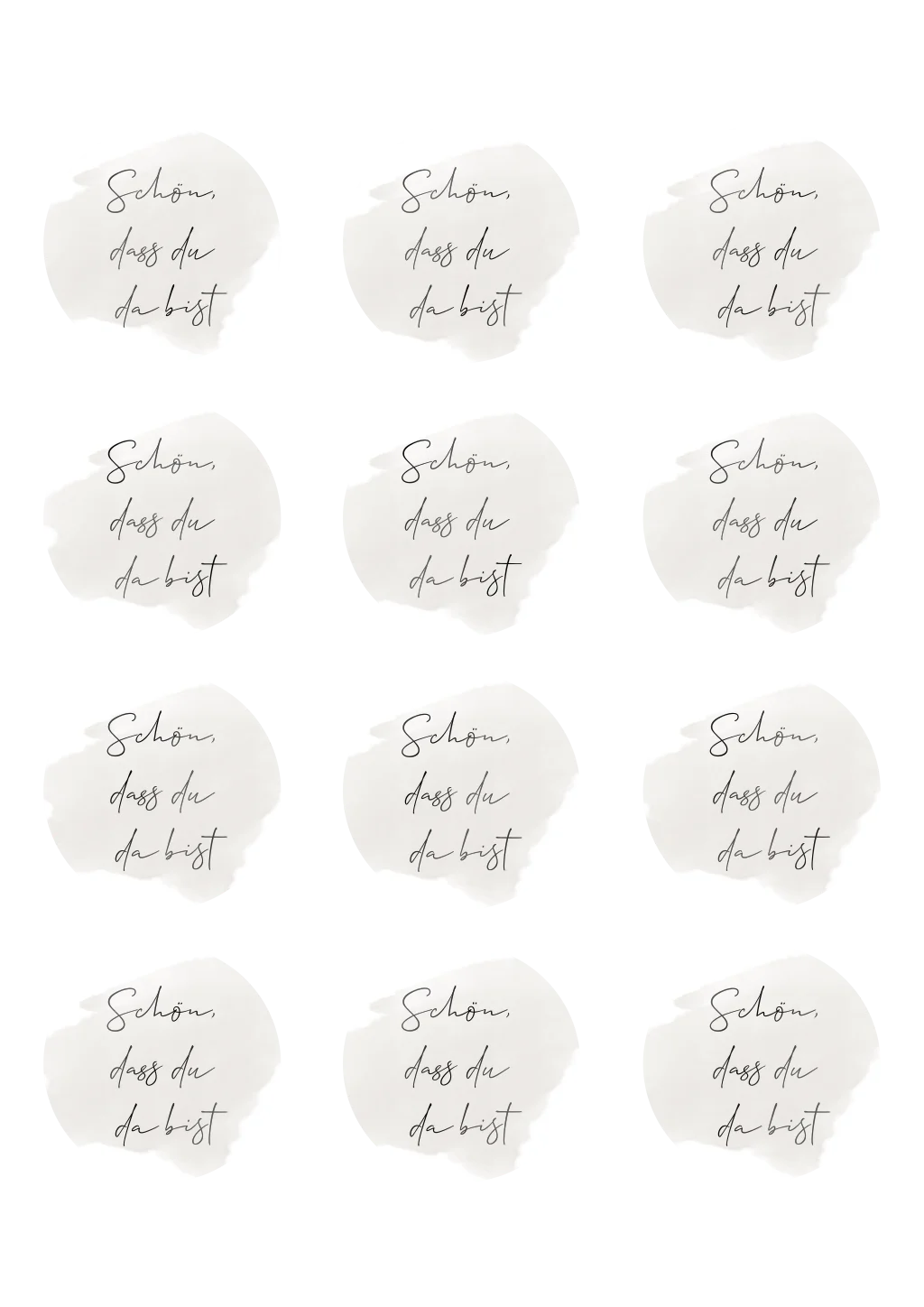 "Schön, dass du da bist" Tischkärtchen für die Hochzeitsfeier in Kreisform mit beigen Aquarell und schwarzer Folie in 9x9 cm.